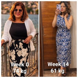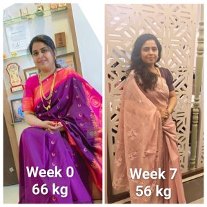 एकूण 8 week मध्ये माझ वजन 76kg वरून 64kg वर आले आहे.. एकूण ११ kg वजन मी कमी केलंय, कमरेचा घेर 6in ने कमी झालंय आणि पोटाचा घेर 7in ने कमी झाला आहे, मी तर खूप खूश आहे सगळे माझ्या आवडीचे ड्रेसस मी पुन्हा घालू शकत आहे. सगळे भेटतील ते लोक मला वजन कमी केलंय आता अजून छान दिसत आहेस अस कौतुक करतात. माझ्या dedication च कौतूक करतात आणि माझ्या dedication च कौतूक माझ्या नवऱ्यानी करावं ही तर खूप च मोठी गोष्ट आहे.