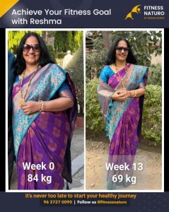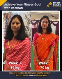 त्यांचे WhatsApp status updates सतत motivation देतात आणि आपल्याला ट्रॅकवर ठेवतात. गेल्या ५ आठवड्यांत मी एकूण १० किलो वजन कमी केलं, आणि हे शक्य झालं Reshma Ma’am आणि Fitness Naturo Team च्या सततच्या support मुळे!